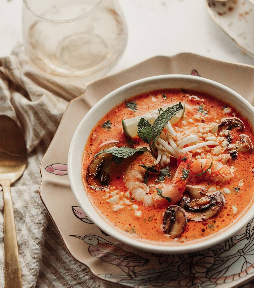 Roasted Tomato Basil Soup with Orange Plum Tomatoes and Purple Thai Basil